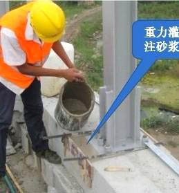 2、攪拌均勻的漿料,放置1-2分鐘,待其中的氣泡基本消失,即可進行灌注。  灌注高度超過鋼板底面5-10mm。如果側擋模板露漿,需要及時補漿,避免出現充填不滿情況。